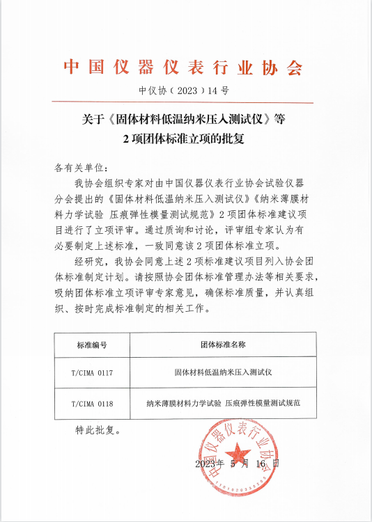 我協(xié)會(huì)組織專家對(duì)由中國(guó)儀器儀表行業(yè)協(xié)會(huì)試驗(yàn)儀器分會(huì)提出的《固體材料低溫納米壓入測(cè)試儀》《納米薄膜材料力學(xué)試驗(yàn) 壓痕彈性模量測(cè)試規(guī)范》2項(xiàng)團(tuán)體標(biāo)準(zhǔn)建議項(xiàng)目進(jìn)行了立項(xiàng)評(píng)審。通過(guò)質(zhì)詢和討論,評(píng)審組專家認(rèn)為有必要制定上述標(biāo)準(zhǔn),一致同意該2項(xiàng)團(tuán)體標(biāo)準(zhǔn)立項(xiàng)。