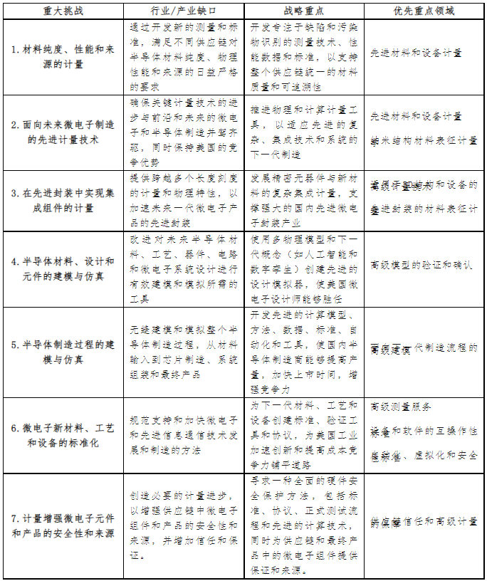 2022年9月的《美國半導(dǎo)體行業(yè)的戰(zhàn)略機(jī)遇》報(bào)告中,確定了從計(jì)量學(xué)角度需要重點(diǎn)關(guān)注的7大挑戰(zhàn),以實(shí)現(xiàn)美國領(lǐng)導(dǎo)的全球半導(dǎo)體行業(yè)的未來國家愿景。到2022年11月,芯片研發(fā)計(jì)量計(jì)劃將其投資組合進(jìn)一步細(xì)化為10個(gè)優(yōu)先重點(diǎn)領(lǐng)域,以解決最關(guān)鍵的計(jì)量研發(fā)缺口。七大挑戰(zhàn)及對應(yīng)優(yōu)先重點(diǎn)領(lǐng)域如下: