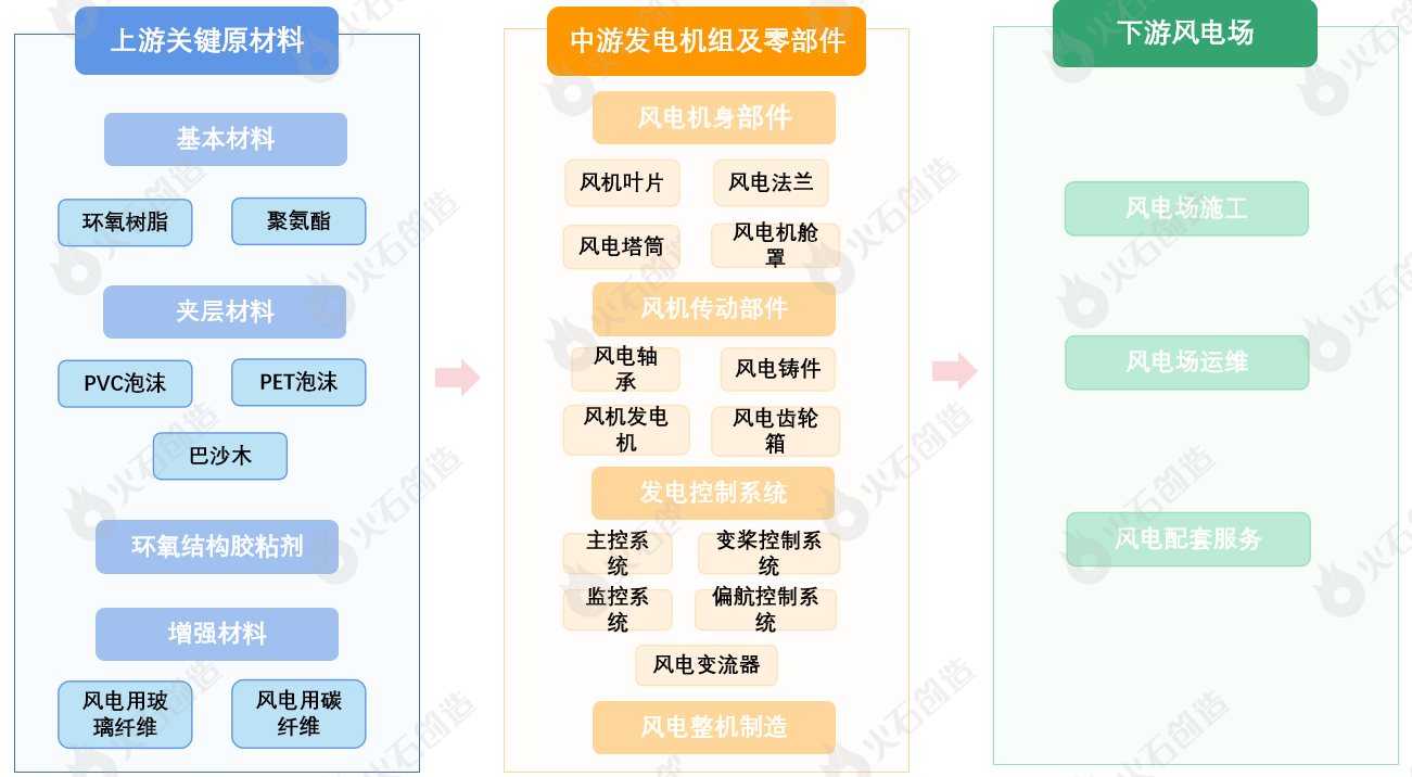 從風(fēng)電產(chǎn)業(yè)鏈看,上游包括環(huán)氧樹脂和聚氨酯等基本材料、PVC泡沫和巴沙木等夾層材料、以及環(huán)氧結(jié)構(gòu)膠粘劑、增強(qiáng)材料等;中游包括風(fēng)電機(jī)身部件、風(fēng)電傳動(dòng)部件、發(fā)電控制系統(tǒng)和風(fēng)電整機(jī)制造等;下游包括風(fēng)電場(chǎng)施工、運(yùn)維即配套服務(wù)等。