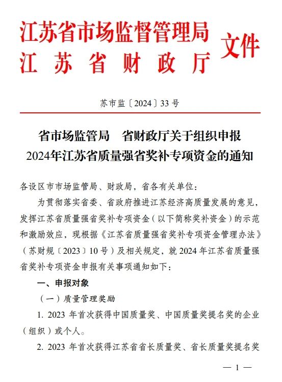 江蘇省市場(chǎng)監(jiān)管局、江蘇省財(cái)政廳發(fā)布關(guān)于組織申報(bào)2024年江蘇省質(zhì)量強(qiáng)省獎(jiǎng)補(bǔ)專項(xiàng)資金的通知,申報(bào)對(duì)象包括2023年首次通過(guò)能源管理體系認(rèn)證或節(jié)能產(chǎn)品認(rèn)證或低碳產(chǎn)品認(rèn)證或綠色產(chǎn)品認(rèn)證,且經(jīng)省市場(chǎng)監(jiān)管局考核評(píng)估為優(yōu)秀的企業(yè)。詳情如下: