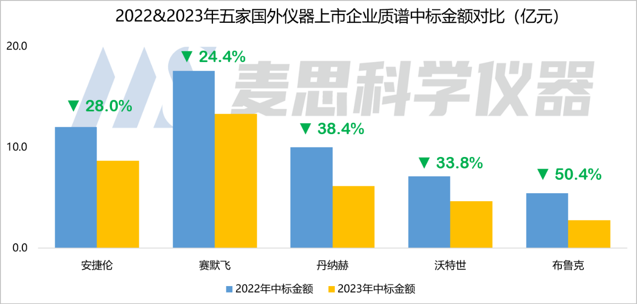 從中標(biāo)數(shù)據(jù)來看,雖然2023年上述五家國外企業(yè)進(jìn)入了中國質(zhì)譜儀器中標(biāo)市場的TOP 10廠商行列,但他們中標(biāo)數(shù)量和中標(biāo)金額同比都有比較明顯的下降。