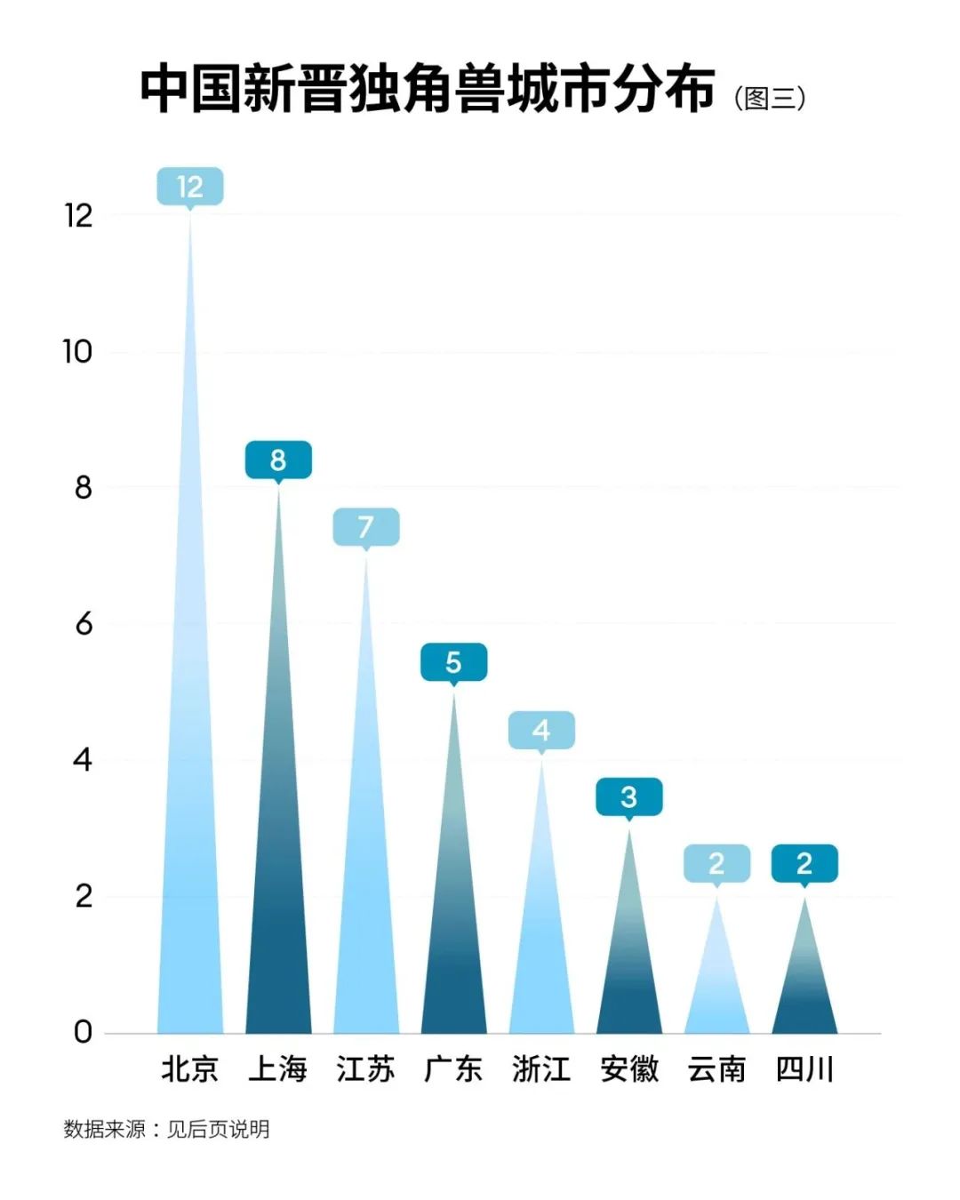 地區(qū)來看,2023年,北京創(chuàng)造了獨角獸總數(shù)的近三分之一,時隔一年反超上海、廣東重回第一。北京新增的獨角獸中近6成與人工智能技術(shù)密切相關(guān);上海則是機器人相關(guān)的獨角獸繼續(xù)發(fā)力,如智元機器人與達闥機器人等均在今年獲得巨額融資。