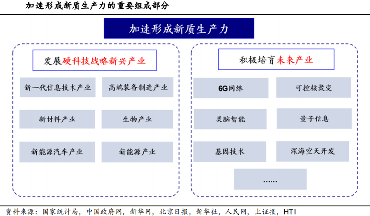 新質(zhì)生產(chǎn)力的核心在于整合科技創(chuàng)新資源,一方面引領(lǐng)發(fā)展戰(zhàn)略性新興產(chǎn)業(yè),國家統(tǒng)計局發(fā)布的《戰(zhàn)略性新興產(chǎn)業(yè)分類(2018)》中有新一代信息技術(shù)產(chǎn)業(yè)、高端裝備制造產(chǎn)業(yè)、新材料產(chǎn)業(yè)、生物產(chǎn)業(yè)、新能源汽車產(chǎn)業(yè)、新能源產(chǎn)業(yè)六大產(chǎn)業(yè)和硬科技的概念不謀而合;另一方面積極培育未來產(chǎn)業(yè),在6G網(wǎng)絡(luò)、可控核聚變、類腦智能、量子信息、基因技術(shù)、深海空天開發(fā)等前沿科技和產(chǎn)業(yè)變革領(lǐng)域贏得發(fā)展主動權(quán),從而以硬科技創(chuàng)新帶動新經(jīng)濟增長點不斷涌現(xiàn)。