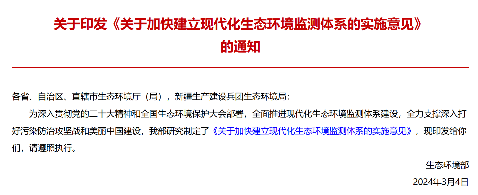 近日,生態環境部印發《關于加快建立現代化生態環境監測體系的實施意見》(簡稱《意見》)。這一實施意見旨在深入貫徹黨的二十大精神和全國生態環境保護大會部署,加快建立現代化生態環境監測體系,全力支撐深入打好污染防治攻堅戰和美麗中國建設,以適應生態文明建設和生態環境保護的新要求。