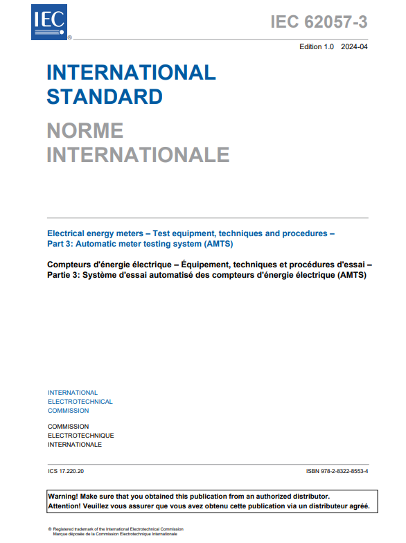 由我國(guó)主導(dǎo)制定的國(guó)際標(biāo)準(zhǔn)《IEC 62057-3電能表測(cè)試設(shè)備、技術(shù)和步驟 第3部分:電能表自動(dòng)化試驗(yàn)系統(tǒng)(AMTS)》于2024年4月23日正式由國(guó)際電工委員會(huì)(IEC)發(fā)布,這是中國(guó)首次在電能計(jì)量領(lǐng)域主導(dǎo)制定IEC國(guó)際標(biāo)準(zhǔn)。