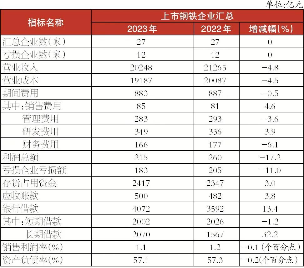 進入2024年第1季度,鋼鐵行業運行情況仍不樂觀,經濟效益繼續下滑。27家上市鋼企合計營業收入4715億元,同比下降5.9%;合計營業成本4533億元,同比下降4.9%;合計期間費用201億元,同比下降1.7%;合計實現利潤虧損1億元,同比由盈變虧;虧損額69億元,同比增長118.1%;虧損面48.2%;平均銷售利潤率-0.02%,同比下降1.02個百分點。截至第1季度末,存貨占用資金同比下降4.3%;應收賬款同比增長8.4%;短期借款同比下降0.3%;長期借款同比增長8.9%;平均資產負債率57.3%,同比下降0.7個百分點。具體各指標情況見下表: