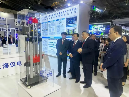 開幕日巡館期間,上海市委副書記、市長龔正蒞臨儀電展臺,詳細了解了超大力值傳感器和100MN力標準測力機研制及應用的相關情況。
