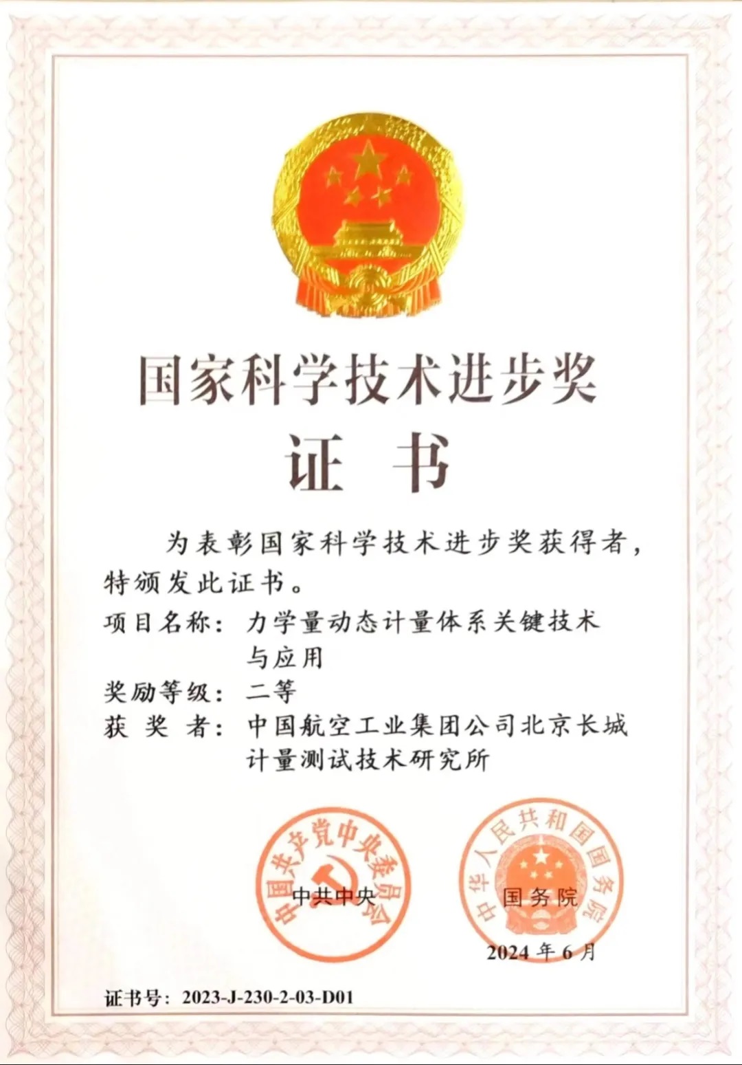全國科技大會、國家科學技術獎勵大會和中國科學院第二十一次院士大會、中國工程院第十七次院士大會6月24日上午在人民大會堂隆重召開,習近平總書記為國家最高科學技術獎獲得者等頒獎并發表重要講話。由航空工業計量所牽頭完成的項目“力學量動態計量體系關鍵技術與應用”獲得國家科技進步二等獎。