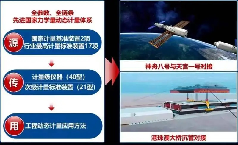 該技術體系為工業與國民經濟領域幾千家單位提供了計量測試高質量產品及服務,在航空航天等高端裝備自主研制中發揮了體系性保障作用,有力支撐了國產大飛機部件測試、國產發動機試驗、特種飛機驗證、飛船與空間站對接、高鐵安全碰撞和港珠澳大橋沉管對接等重大項目,實現了高水平計量技術的自立自強。