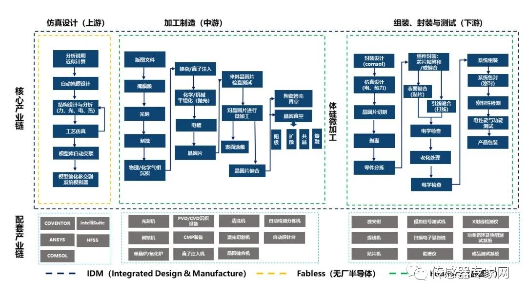 如下圖所示,智能傳感器產業鏈非常長,涉及數十個環節,產業鏈的每個環節投入都較大,單一企業很難獨自承受產業鏈所有環節所需要的技術知識、人力成本及設備投入,且只有每個環節的產量足夠大,才能覆蓋其綜合成本,因而,智能傳感產業發展呈現出專業化、規模化和智能化的特點,即每個環節都可成為一家獨立的公司參與到產業鏈的生態發展,而生產制造環節是所有環節中投入最大的部分。