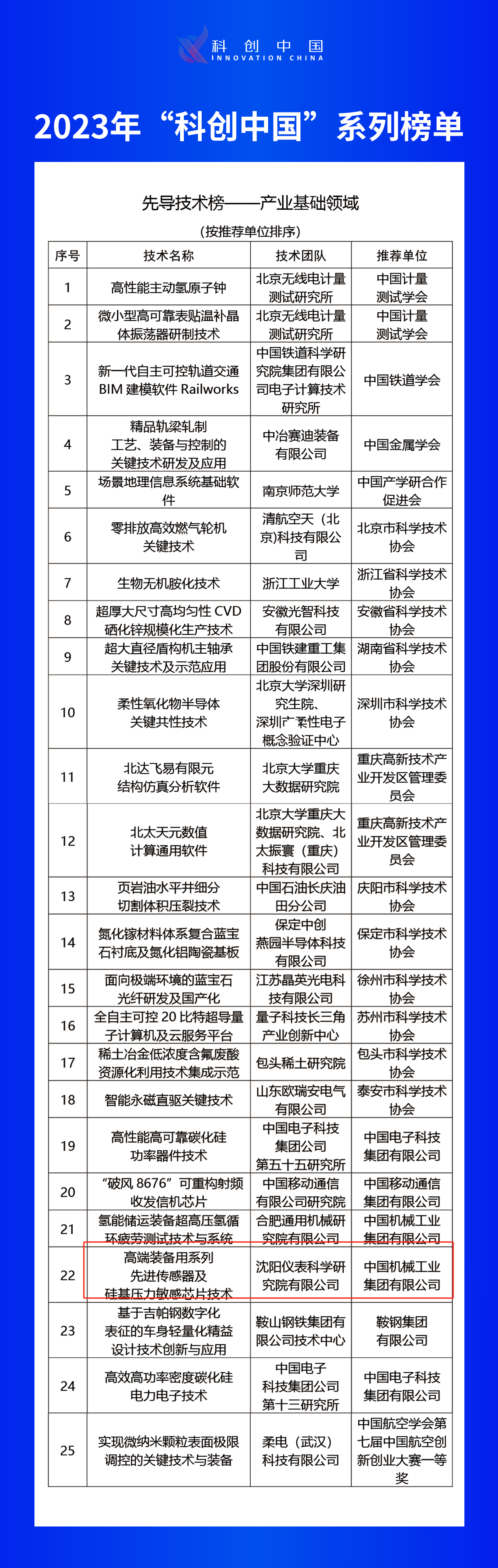 7月2日,2023年“科創中國”系列榜單在第二十六屆中國科協年會上發布,傳感器國家工程研究中心的“高端裝備用系列先進傳感器及硅基壓力敏感芯片技術” 入選年度先導技術榜!