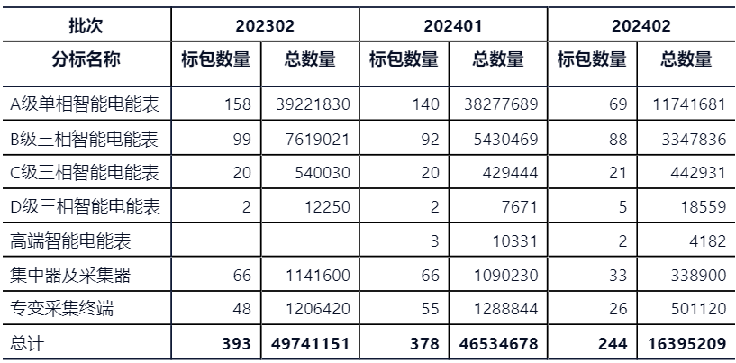國網計量設備2024年第二批招標公告已發布,共7個分標,244個標包,單相電能表1174.17萬只、三相電能表381.35萬只(B級334.78萬只、C級44.29萬只、D級1.85萬只、高端4182只)、集中器33.89萬只、專變50.11萬只(其中模組化專變1430只、專變III型22.69萬只、專變II型0.5萬只、專變I型1.8萬只)。