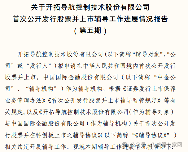 2023 年 4 月 28 日,開(kāi)拓導(dǎo)航與中國(guó)國(guó)際金融股份有限公司簽署IPO輔導(dǎo)協(xié)議,截止2024年7月19日,已完成第五期輔導(dǎo)工作。