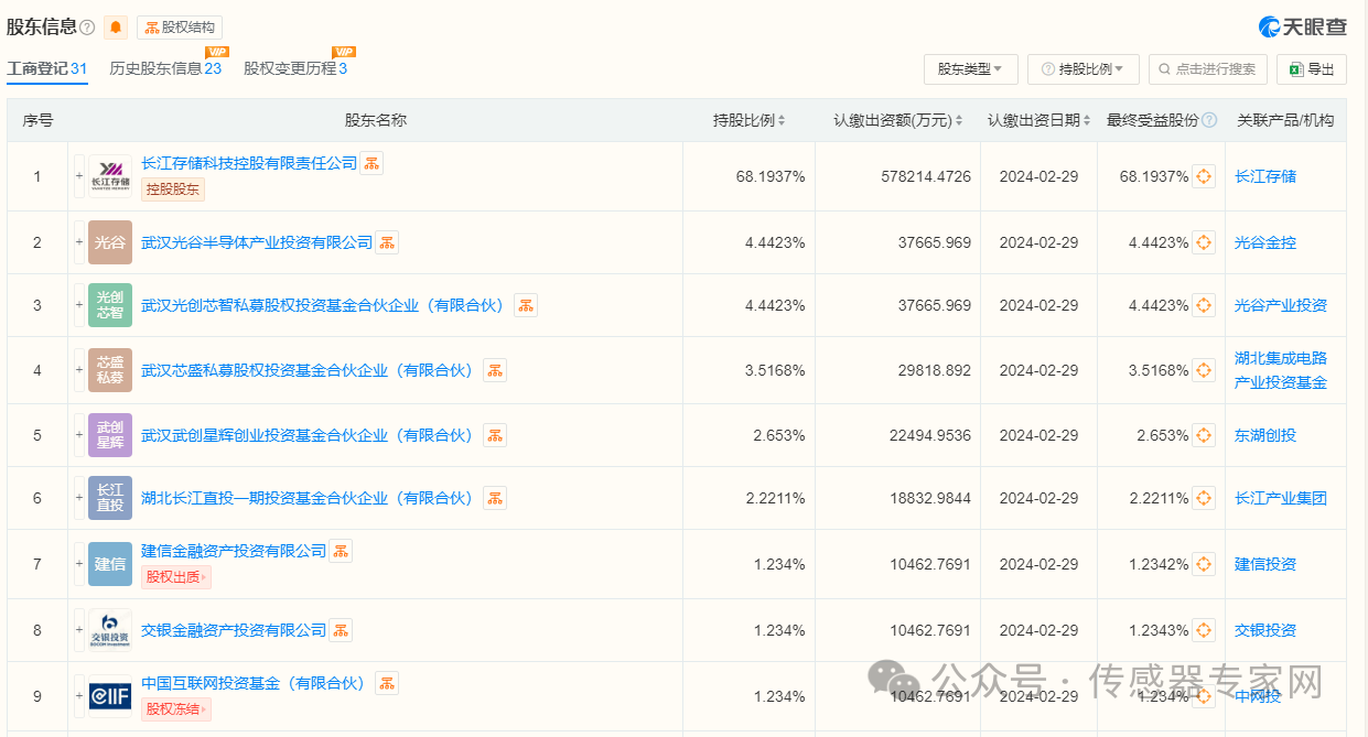 2024年2月29日,武漢新芯引入30多家投資機(jī)構(gòu),包括廈門(mén)炬達(dá)二號(hào)投資合伙企業(yè)(有限合伙),武漢金融控股,武漢光谷半導(dǎo)體產(chǎn)業(yè)投資有限公司,武漢光創(chuàng)芯智私募股權(quán)投資基金,國(guó)鑫創(chuàng)投,招銀國(guó)際,長(zhǎng)投集團(tuán),謝諾投資,中信證券,中國(guó)農(nóng)業(yè)銀行,中銀金融,湖北高投,恒盛融通投資,建信投資,中國(guó)工商銀行,東湖創(chuàng)投,交銀金融資產(chǎn)投資有限公司,海通創(chuàng)意資本,湖北長(zhǎng)江直投等等。目前,武漢新芯的控股股東為長(zhǎng)江存儲(chǔ), 持股超68%。