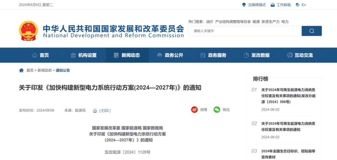 國家發展改革委、國家能源局、國家數據局8月6日聯合發布《加快構建新型電力系統行動方案(2024—2027年)》。