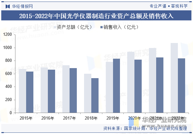 根據(jù)國家統(tǒng)計局?jǐn)?shù)據(jù),近年來我國光學(xué)儀器制造行業(yè)資產(chǎn)總額及銷售收入總體呈現(xiàn)出增長態(tài)勢,2015-2022年,行業(yè)資產(chǎn)總額由674.99億元增長至1072.58億元,CAGR為6.84%,行業(yè)銷售收入由632.65億元增長至835.72,CAGR為4.06%。