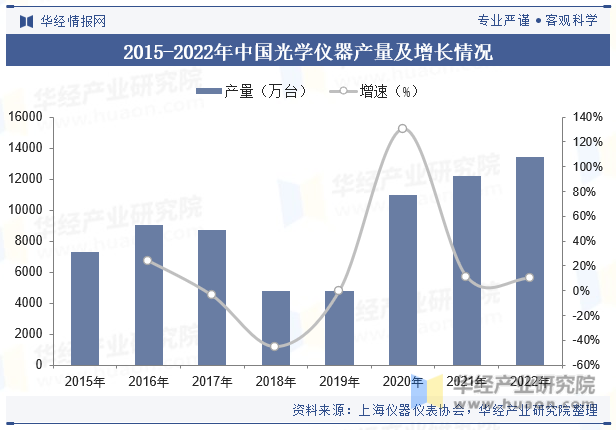 光學(xué)儀器是儀器儀表行業(yè)中非常重要的組成類別,從產(chǎn)量來看,近幾年國內(nèi)光學(xué)儀器產(chǎn)量大幅增長,2020年中國光學(xué)儀器產(chǎn)量突破1億臺,同比增速達(dá)130.35%,2022年產(chǎn)量增長至1.35億臺,同比上漲10.05%。