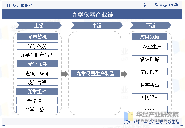 我國光學(xué)儀器行業(yè)產(chǎn)業(yè)鏈上游主要包括光電整機、光學(xué)元件以及光學(xué)組件供應(yīng)商;中游為光學(xué)儀器生產(chǎn)制造環(huán)節(jié),下游應(yīng)用領(lǐng)域廣泛,是工農(nóng)業(yè)生產(chǎn)、資源勘探空間探索、科學(xué)實驗、國防建設(shè)以及社會生活各個領(lǐng)域不可缺少的觀察、測試分析、控制、記錄和傳遞的工具。