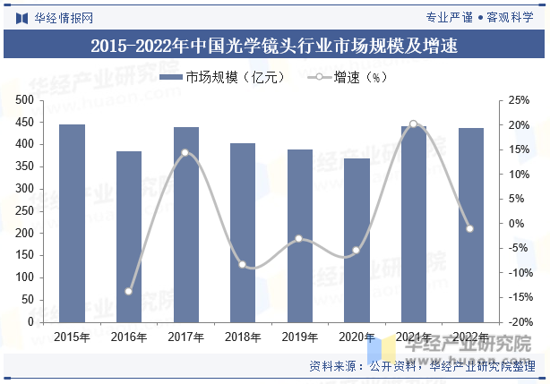鏡頭是光學(xué)儀器的核心部件,20世紀(jì)以來光電子技術(shù)的快速發(fā)展帶動光學(xué)鏡頭的應(yīng)用范圍從最初的顯微鏡、望遠(yuǎn)鏡、膠片相機等領(lǐng)域向安防視頻監(jiān)控、數(shù)碼相機/攝像機和智能手機等領(lǐng)域滲透。數(shù)據(jù)顯示,2022年我國光學(xué)鏡頭行業(yè)市場規(guī)模約為437.49億元,同比減少1.16%。
