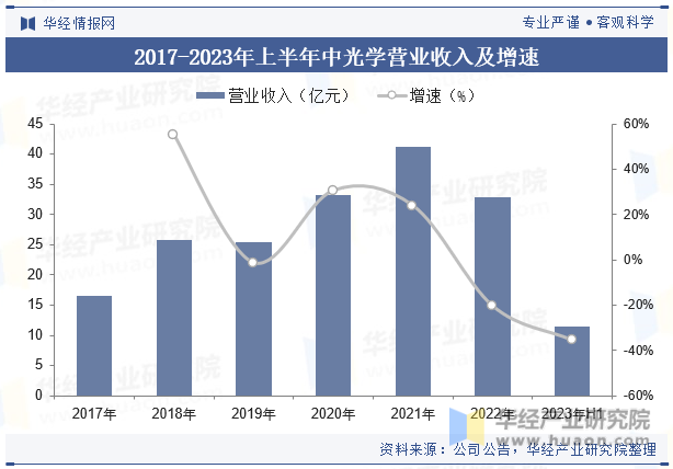 中光學(xué)集團(tuán)成立于1991年,是中國光學(xué)儀器行業(yè)的領(lǐng)先企業(yè)之一。公司總部位于北京,擁有多個制造基地和研發(fā)中心,先后榮獲多項級獎項,是中國光學(xué)儀器行業(yè)的標(biāo)志性企業(yè)。2022年受疫情反復(fù)、芯片短缺等綜合因素影響,營業(yè)收入下降至32.85億元,同比縮減20.44%,2023年上半年實現(xiàn)營收11.5億元,較2022年同比減少35.54%。