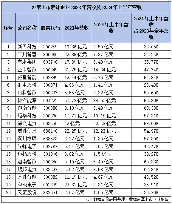 儀表網(wǎng)整理了20家上市表計企業(yè)2023年營業(yè)收入以及2024年上半年營業(yè)收入數(shù)據(jù),從中一窺我國表計產(chǎn)業(yè)今年和明年發(fā)展態(tài)勢。