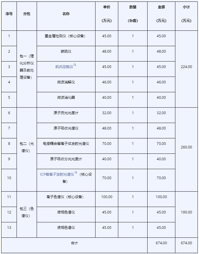 包一:理化分析儀器及前處理設(shè)備。單臺設(shè)備最高限價:厭氧工作站 1(臺套)29萬元 、多功能酶標(biāo)儀1(臺套)28萬元、全自動氨基酸分析儀1(臺套)52萬元 、超級微波化學(xué)平臺1(臺套)70萬元 、微量閉口閃點儀1(臺套)35萬元 、自動電位滴定儀1(臺套)27萬元 。合計最高限價:241萬元。