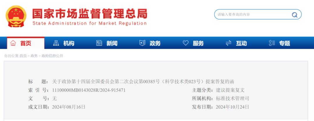 日前,市場監管總局在《關于政協第十四屆全國委員會第二次會議第00385號(科學技術類023號)提案答復的函》中表示,市場監管總局(國家標準委)高度重視標準化支撐高質量發展的基礎性引領性作用,正加快推動相關工作。具體內容如下: