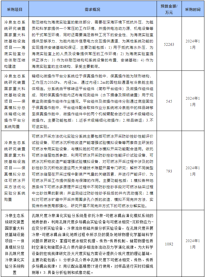 近日,中國(guó)科學(xué)院南海海洋研究所發(fā)布8項(xiàng)儀器設(shè)備采購(gòu)意向,預(yù)算總額達(dá)5.61億元,涉及海底實(shí)驗(yàn)室分總體耐壓結(jié)構(gòu)建造、保真模擬分總體精細(xì)化微操作平臺(tái)分系統(tǒng)、保真模擬分總體可燃冰開采方法優(yōu)化實(shí)驗(yàn)分系統(tǒng)、保真模擬分總體孔隙尺度冷泉演化實(shí)驗(yàn)分系統(tǒng)等,預(yù)計(jì)采購(gòu)時(shí)間為2024年11~12月。