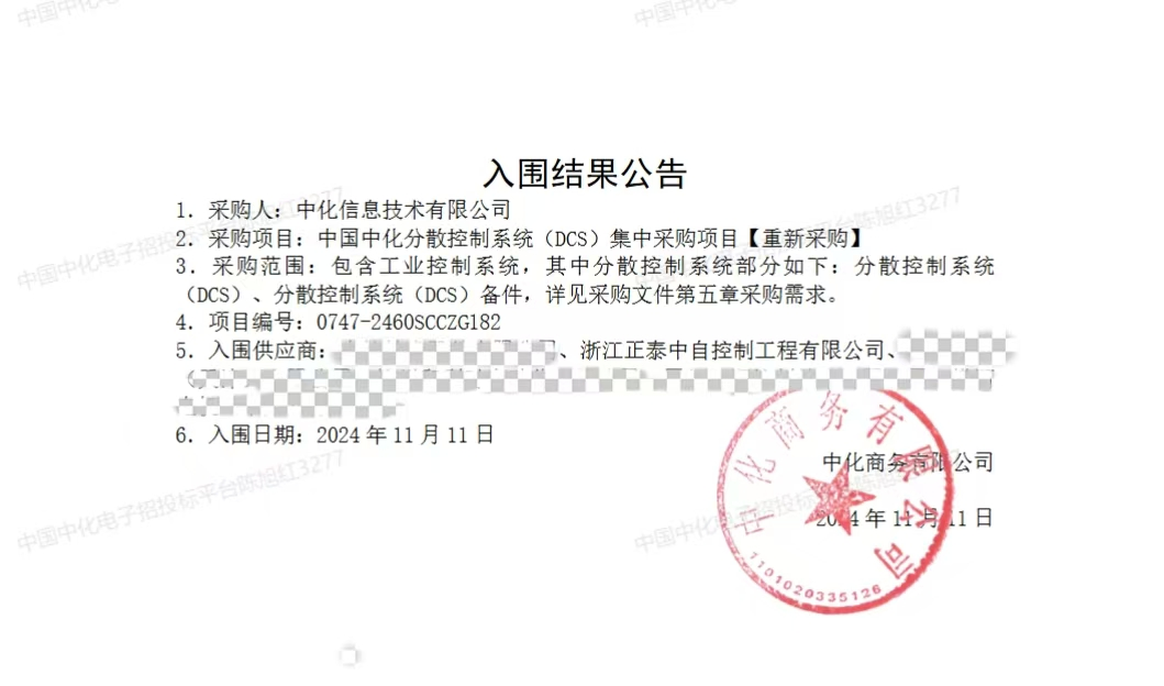 正泰中自成功入圍中國(guó)中化分散控制系統(tǒng)(DCS)集中