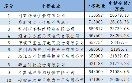 本次中標金額前五名企業為河南許繼儀表有限公司、威勝集團(含威勝信息)、杭州炬華科技股份有限公司、煙臺東方威思頓電氣有限公司、寧波三星醫療電氣股份有限公司。
