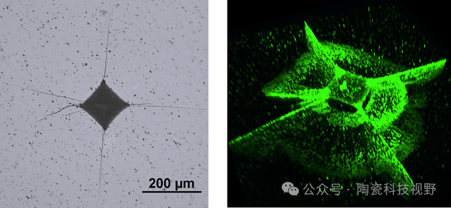 將方形金字塔形金剛石壓頭(維氏壓頭)壓入陶瓷表面,人為地引入壓痕和裂紋。使用普通金相顯微鏡觀察反射圖像時,只能在暴露于表面的區(qū)域觀察到裂紋,如下圖左所示,為此,研究團隊開發(fā)了一種在室溫和大氣壓下使用激光熒光顯微鏡從表面沿深度方向觀察熒光圖像的技術(shù)。