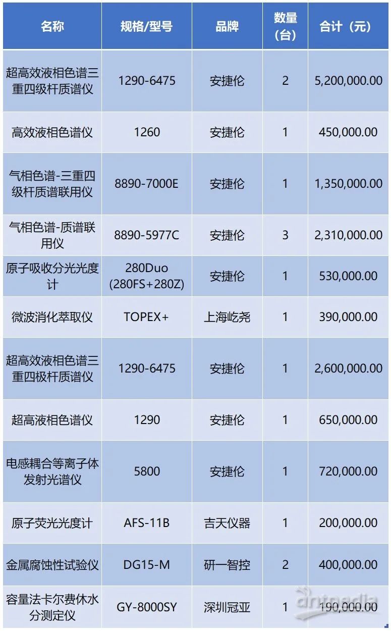 烏魯木齊海關(guān)近日再次發(fā)布關(guān)于海關(guān)實驗室儀器設(shè)備更新項目中標(biāo)公告,本次采購的16臺設(shè)備涉及超高效液相色譜三重四級桿質(zhì)譜儀、氣相色譜-三重四級桿質(zhì)譜聯(lián)用儀、電感耦合等離子體發(fā)射光譜儀等一批分析測試設(shè)備,安捷倫、上海屹堯、吉天儀器等品牌中標(biāo),其中安捷倫占據(jù)11臺。