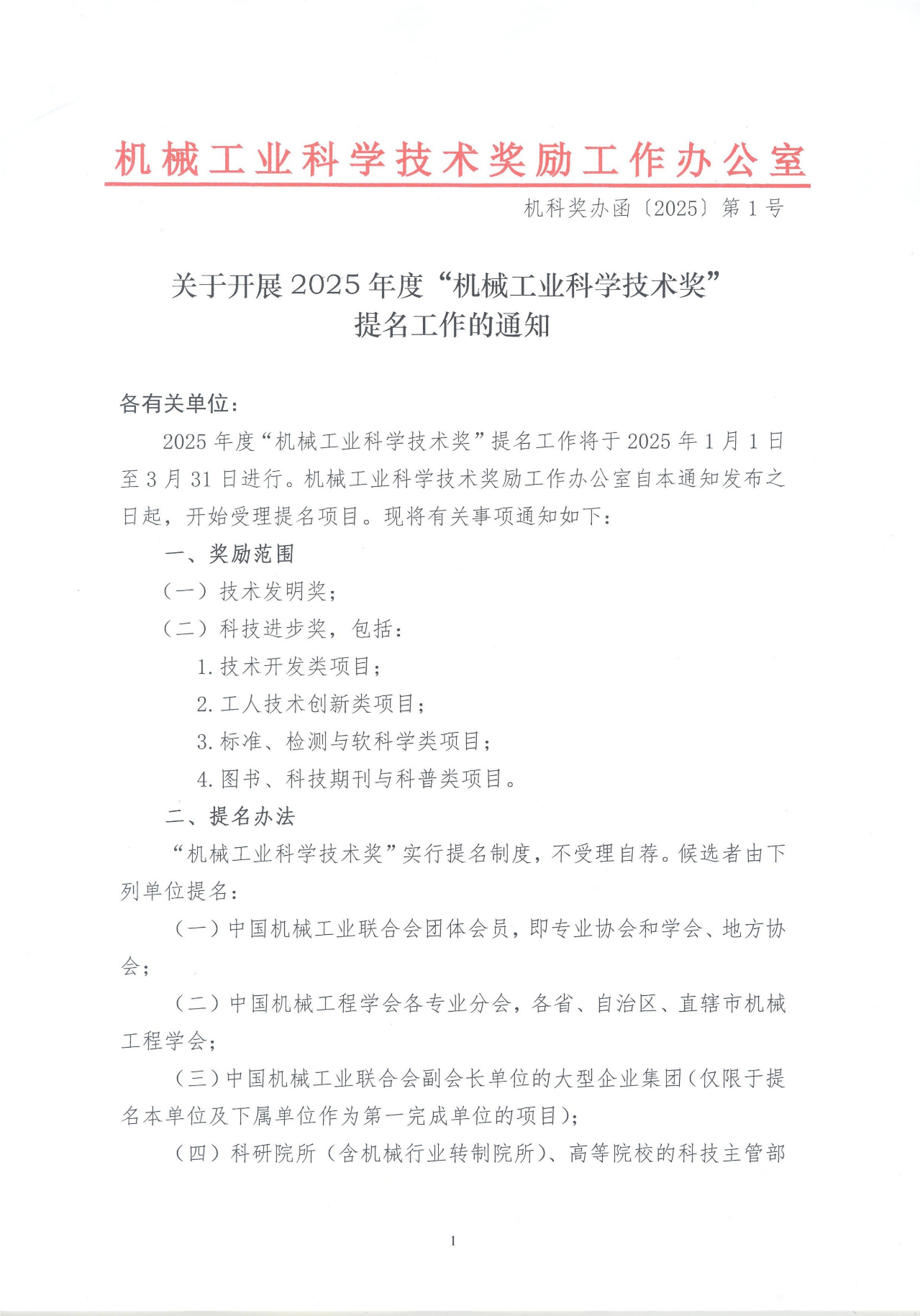 2025年度“機械工業(yè)科學(xué)技術(shù)獎”提名工作將于2025年1月1日至3月31日進行。機械工業(yè)科學(xué)技術(shù)獎勵工作辦公室自本通知發(fā)布之日起,開始受理提名項目。現(xiàn)將有關(guān)事項通知如下:(詳見通知正文)