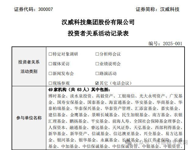 115日,漢威科技獲49家投資機構調研,人形機器人領域相關傳感器產品,尤其是旗下蘇州能斯達公司柔性傳感器產品,備受投資者關注。漢威科技透露柔性傳感器產品產線飽和,2025年將投入新產線運行。