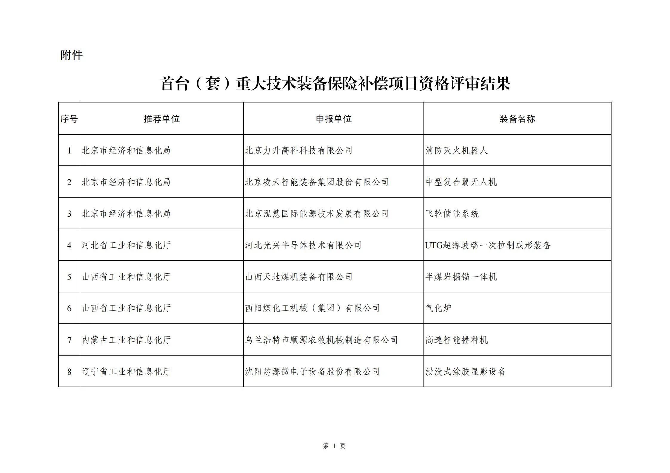 附件:首臺(套)重大技術裝備保險補償項目資格評審結果
