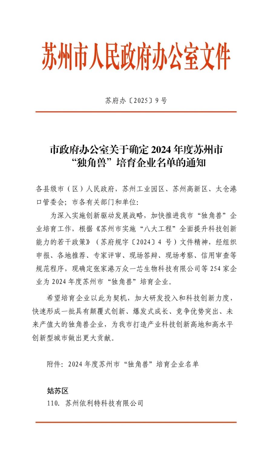 2025年2月11日,蘇州——近日,蘇州市政府正式發(fā)布《2024年度蘇州市“獨(dú)角獸”培育企業(yè)名單》,蘇州依利特科技有限公司作為姑蘇區(qū)首家且唯一入選企業(yè),成功躋身這一具有戰(zhàn)略意義的創(chuàng)新梯隊(duì)。這一里程碑式突破,標(biāo)志著姑蘇區(qū)在培育高成長性科技企業(yè)、構(gòu)建現(xiàn)代化產(chǎn)業(yè)體系方面取得重要進(jìn)展。