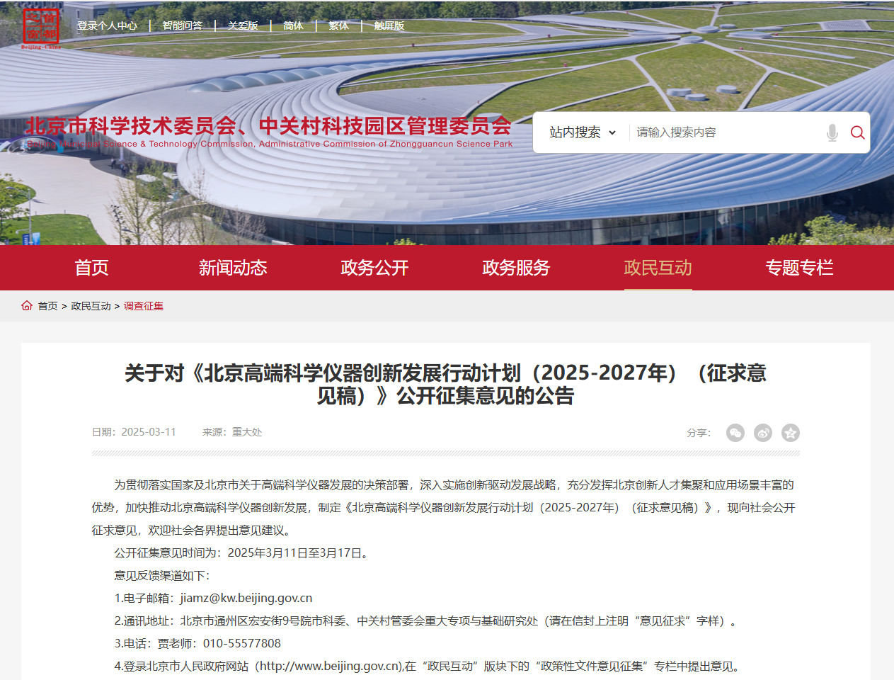 1. 《北京高端科學(xué)儀器創(chuàng)新發(fā)展行動計劃(2025-2027年)(征求意見稿)》