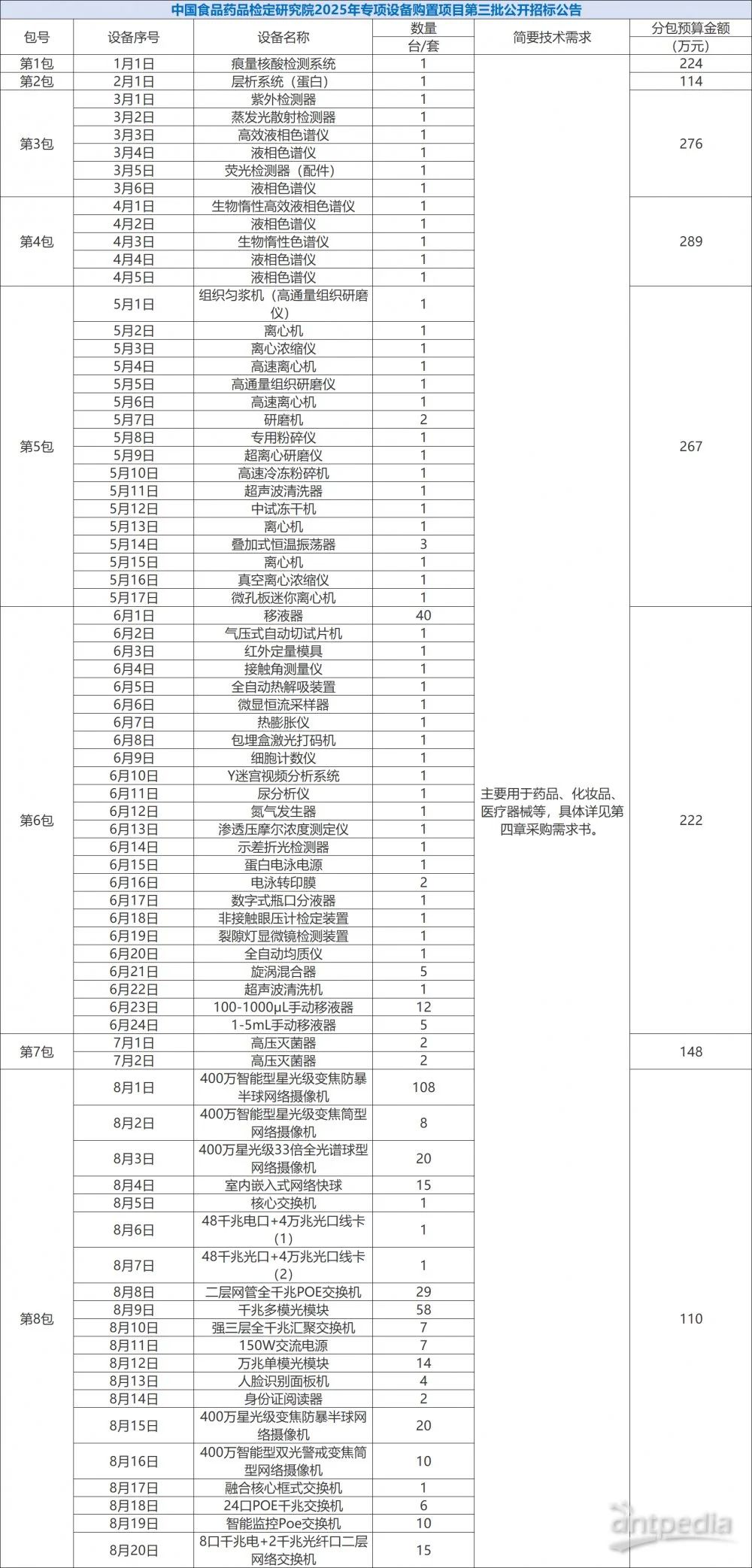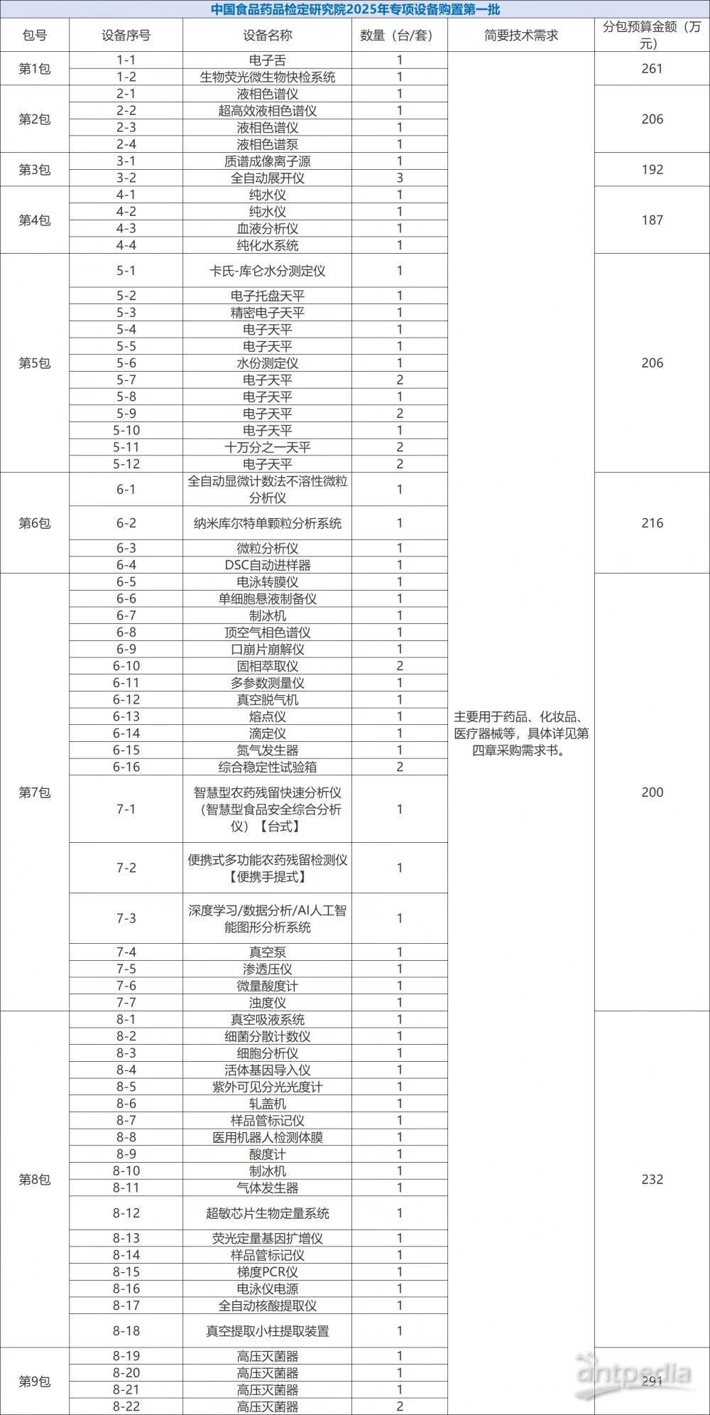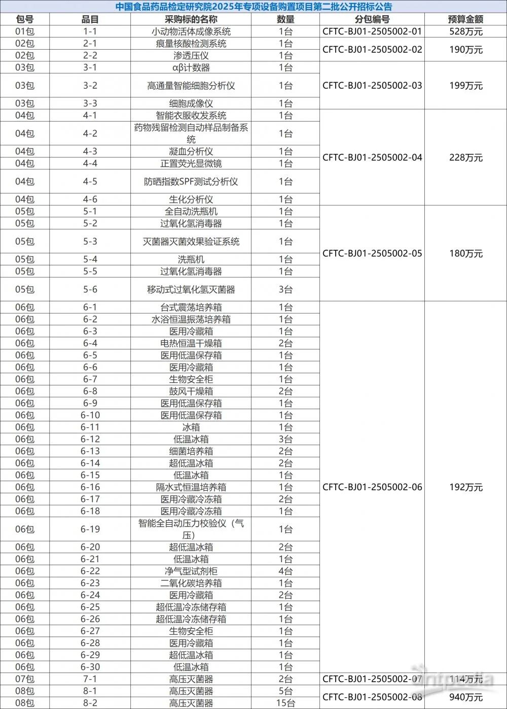 中國政府采購網(wǎng)消息,近日,中國食品藥品檢定研究院就2025年專項設(shè)備購置項目分別于6月24日和7月4日發(fā)布招標(biāo)公告,招標(biāo)總金額為6212萬元,采購的儀器設(shè)備共計605臺/套,包括超高效液相色譜儀、生物熒光微生物快檢系統(tǒng)、小動物活體成像系統(tǒng)等。