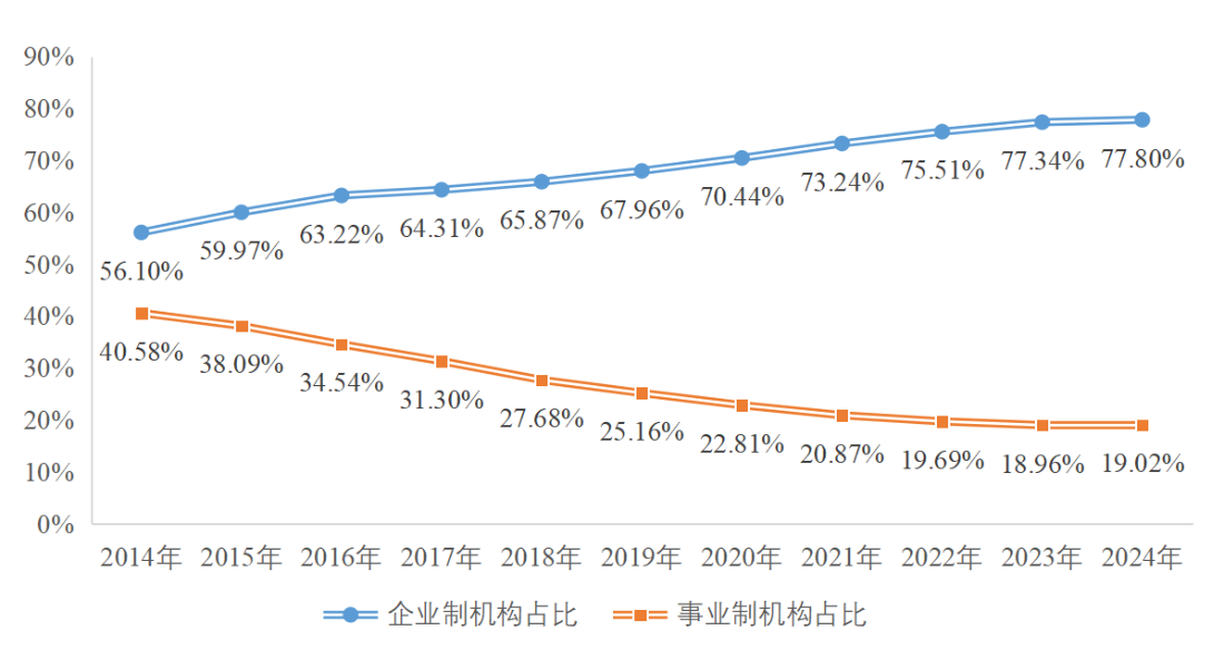 圖1-1 2014-2024年企業(yè)制機(jī)構(gòu)和事業(yè)制機(jī)構(gòu)占比情況