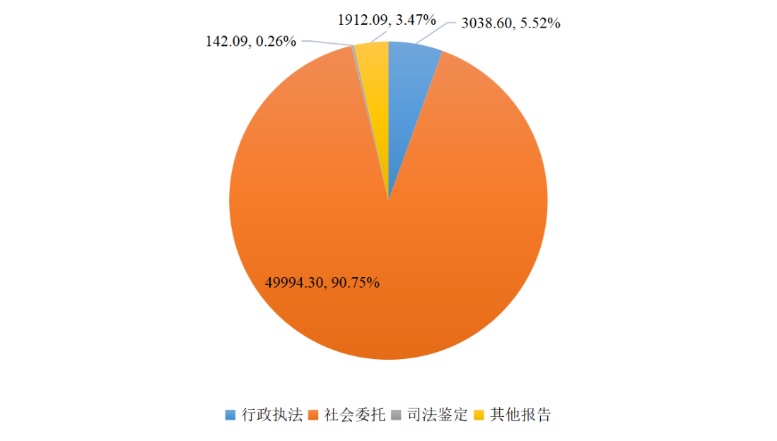 2024年共出具檢驗(yàn)檢測(cè)報(bào)告5.51億份,同比下降8.66%,平均每天對(duì)社會(huì)出具各類報(bào)告150.92萬(wàn)份。其中,出具行政執(zhí)法類報(bào)告3038.60萬(wàn)份,占比5.52%,同比下降8.25%;出具社會(huì)委托類報(bào)告49994.30萬(wàn)份,占比90.75%,同比下降7.06%;出具司法鑒定類報(bào)告數(shù)142.09萬(wàn)份,占比0.26%,同比增長(zhǎng)0.76%。