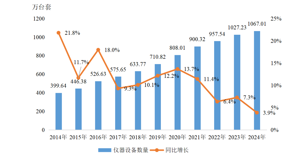 圖1-3 2014-2024年全國(guó)檢驗(yàn)檢測(cè)機(jī)構(gòu)儀器設(shè)備數(shù)量及增長(zhǎng)情況