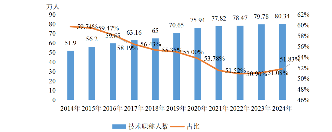 圖1-4 2014-2024年全國(guó)檢驗(yàn)檢測(cè)機(jī)構(gòu)擁有技術(shù)職稱人員分布情況