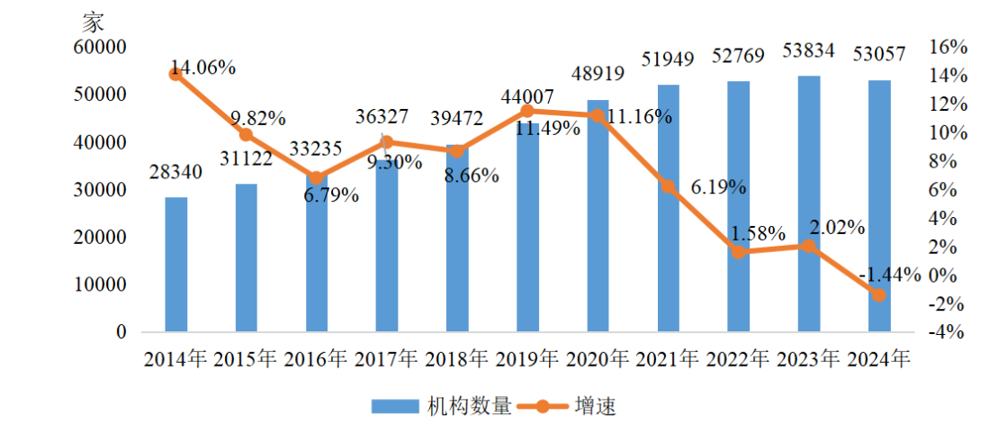 圖2-1 2014-2024年全國(guó)檢驗(yàn)檢測(cè)機(jī)構(gòu)數(shù)量及增速情況
