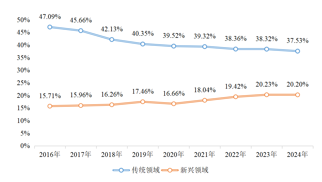 圖2-2 2016-2024年檢驗(yàn)檢測(cè)傳統(tǒng)和新興領(lǐng)域占行業(yè)總收入比重情況