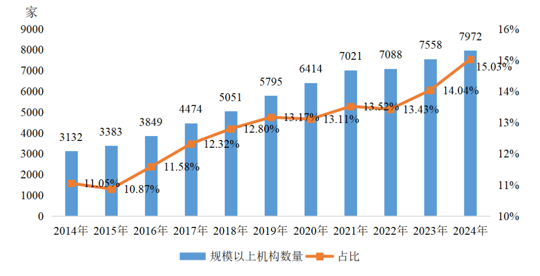 圖3-1 2014-2024年規(guī)模以上檢驗(yàn)檢測(cè)機(jī)構(gòu)數(shù)量分布情況