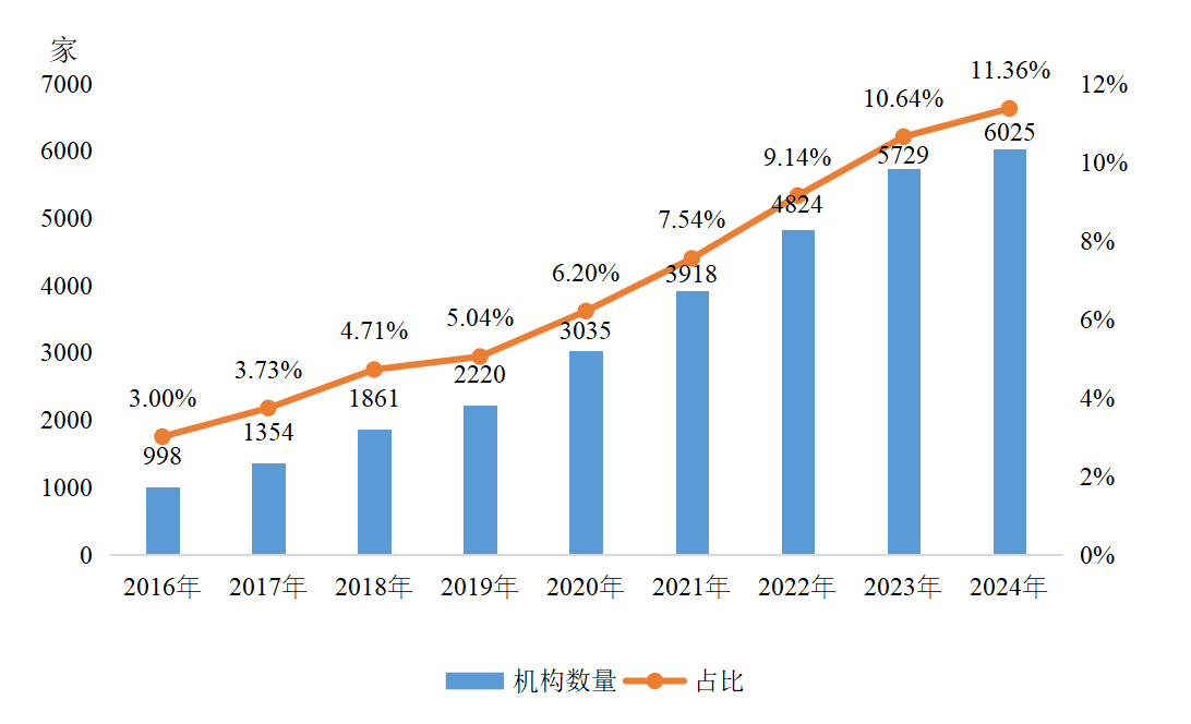 圖3-2 2014-2024年小型和微型檢驗(yàn)檢測(cè)機(jī)構(gòu)數(shù)量及占比情況