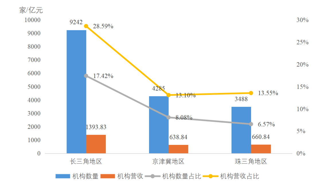 圖4-2 2024年長(zhǎng)三角、京津冀和珠三角地區(qū)機(jī)構(gòu)數(shù)量、營(yíng)收及占比情況