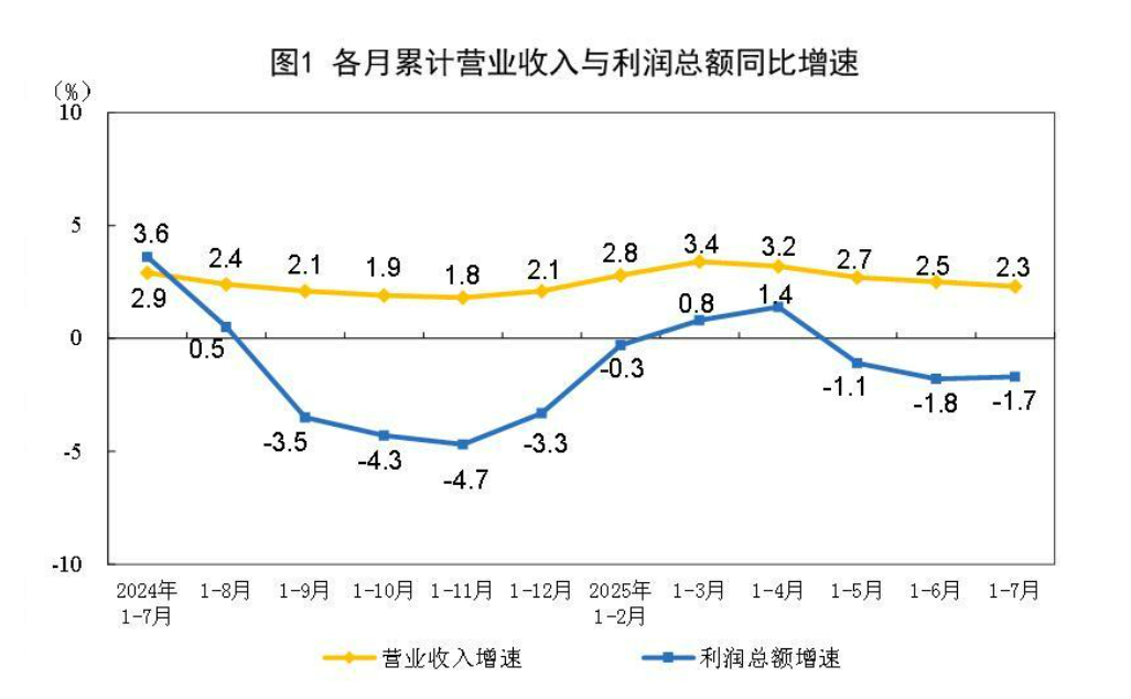 1—7月份,全國規(guī)模以上工業(yè)企業(yè)實現(xiàn)利潤總額40203.5億元,同比下降1.7%(按可比口徑計算,詳見附注二)。