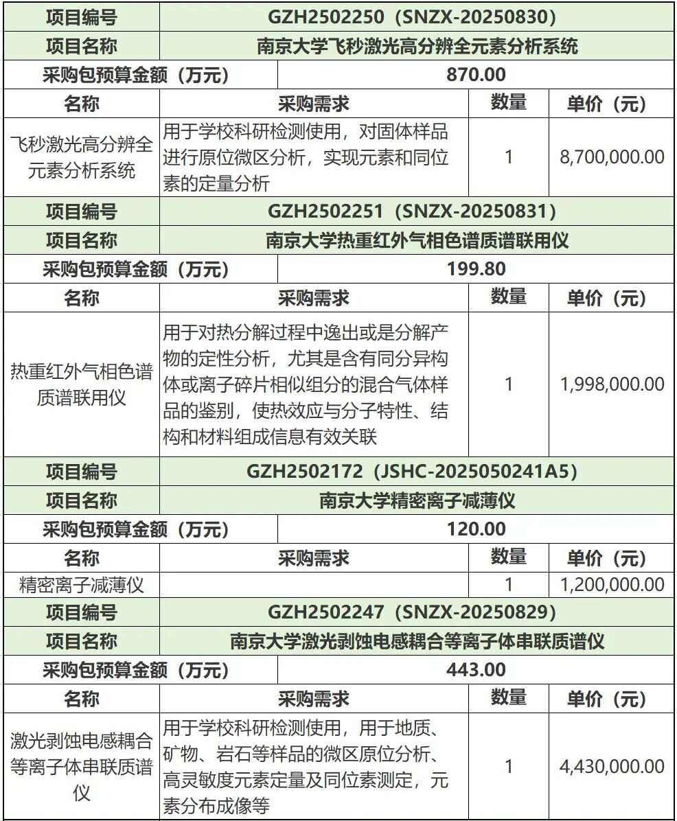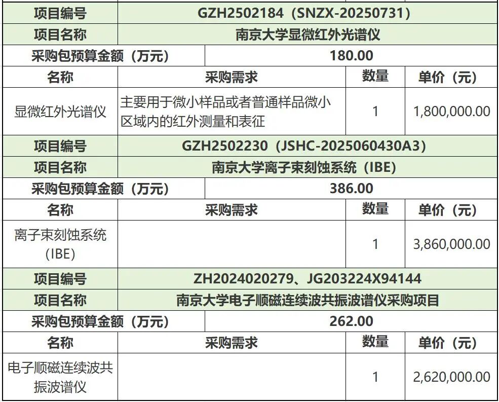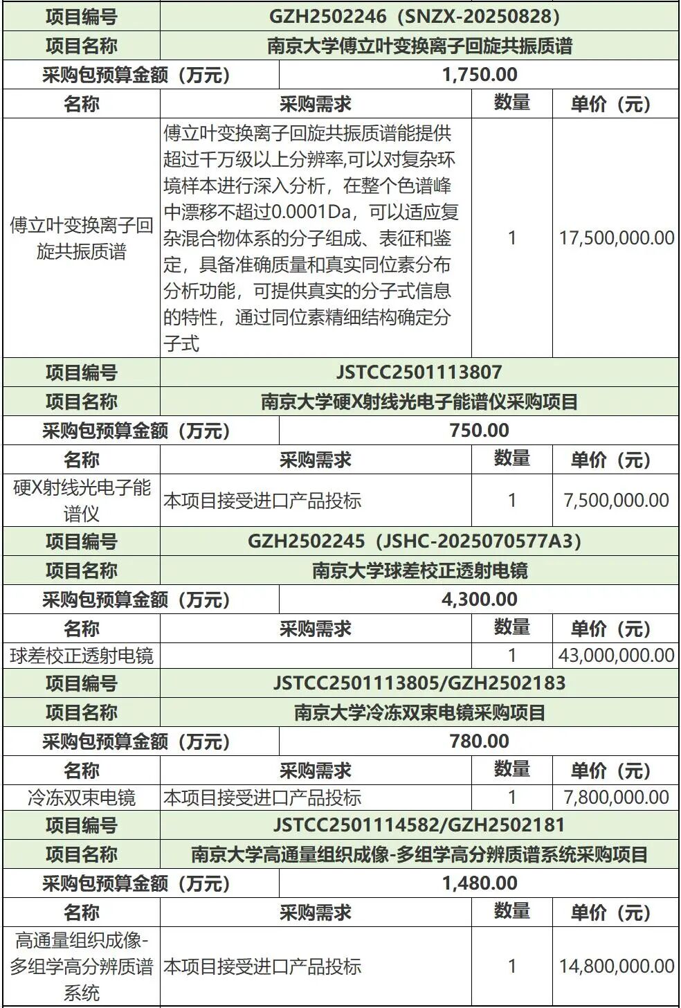 近日,南京大學多個科研儀器設(shè)備招標項目發(fā)布,采購包括激光剝蝕電感耦合等離子體串聯(lián)質(zhì)譜儀、球差校正透射電鏡、冷凍雙束電鏡、飛秒激光高分辨全元素分析系統(tǒng),熱重紅外氣相色譜質(zhì)譜聯(lián)用儀、傅立葉變換離子回旋共振質(zhì)譜、硬X射線光電子能譜儀、高通量組織成像-多組學高分辨質(zhì)譜系統(tǒng)、場發(fā)射電子探針顯微分析儀、顯微紅外光譜儀等,總采購金額超1.45億元。