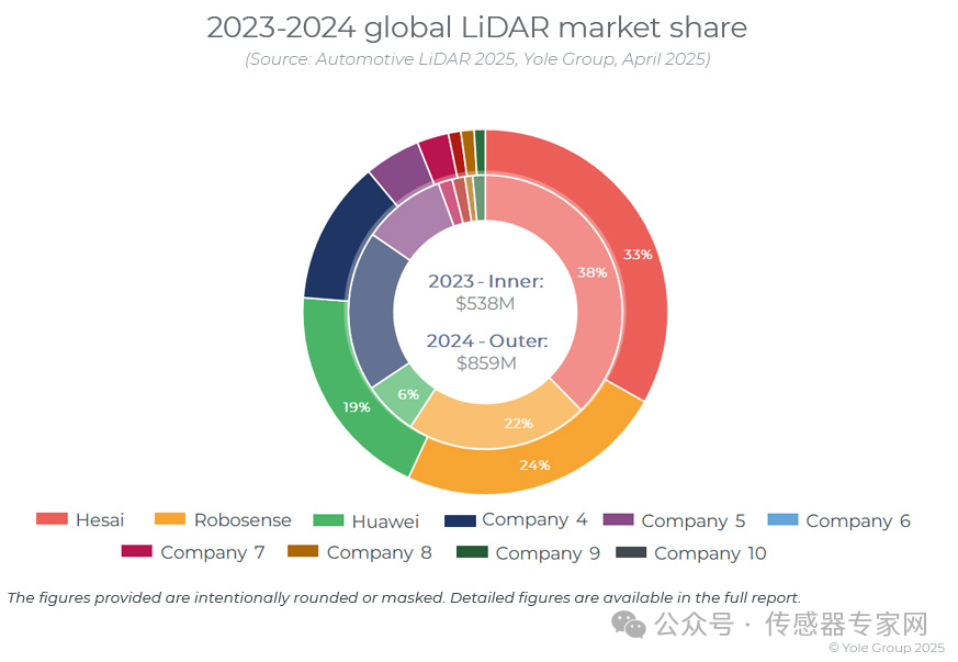 據(jù)今年4月份,咨詢機構(gòu)Yole Group發(fā)布最新全球激光雷達(dá)產(chǎn)業(yè)報告《Automotive LiDAR 2025 》(2025車載激光雷達(dá)報告)數(shù)據(jù)顯示,中國激光雷達(dá)廠商禾賽科技占據(jù)33%的市場份額,其次是速騰聚創(chuàng)(24%)、華為(19%)和圖達(dá)通。這四家中國廠商占據(jù)了88%的市場份額。